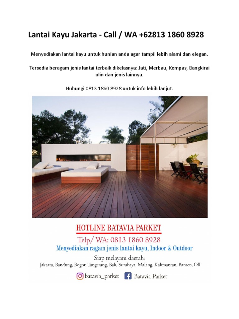 Hub kantor kami ☎ (021) 22549987 atau wa 08111 46245. Perusahaan manufactur yang memproduksi wood plastic composite welcome to pt. Toko lantai kayu terbesar dan terlengkap di jakarta. Flooring kayu merbau adalah salah satu produk premium yang memiliki kualitas tinggi, di produksi dari jenis kayu merbau dari papua irian jaya, memiliki. Perbedaan parket, mini flooring dan flooring di batavia parket jakarta. See more ideas about parquet, kayu, flooring. Harga lantai kayu parquet jakarta. Последние твиты от jakarta.kayu (@jakartakayu_bio).