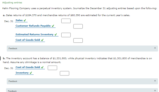 Sales returns of $163,670 and merchandise returns of $66,910 are estimated for the current year's sales. Journalize the december 31 adjusting entries based upon the following: Adjusting entries hahn flooring company uses a perpetual inventory system. Sales returns of $ 125, 000 \$ 125,000 $125, 000 and merchandise returns of $ 80, 000 \$ 80,000 $80, 000 are estimated for the current year's sales. Journalize the december 31 adjusting entries based upon the following: